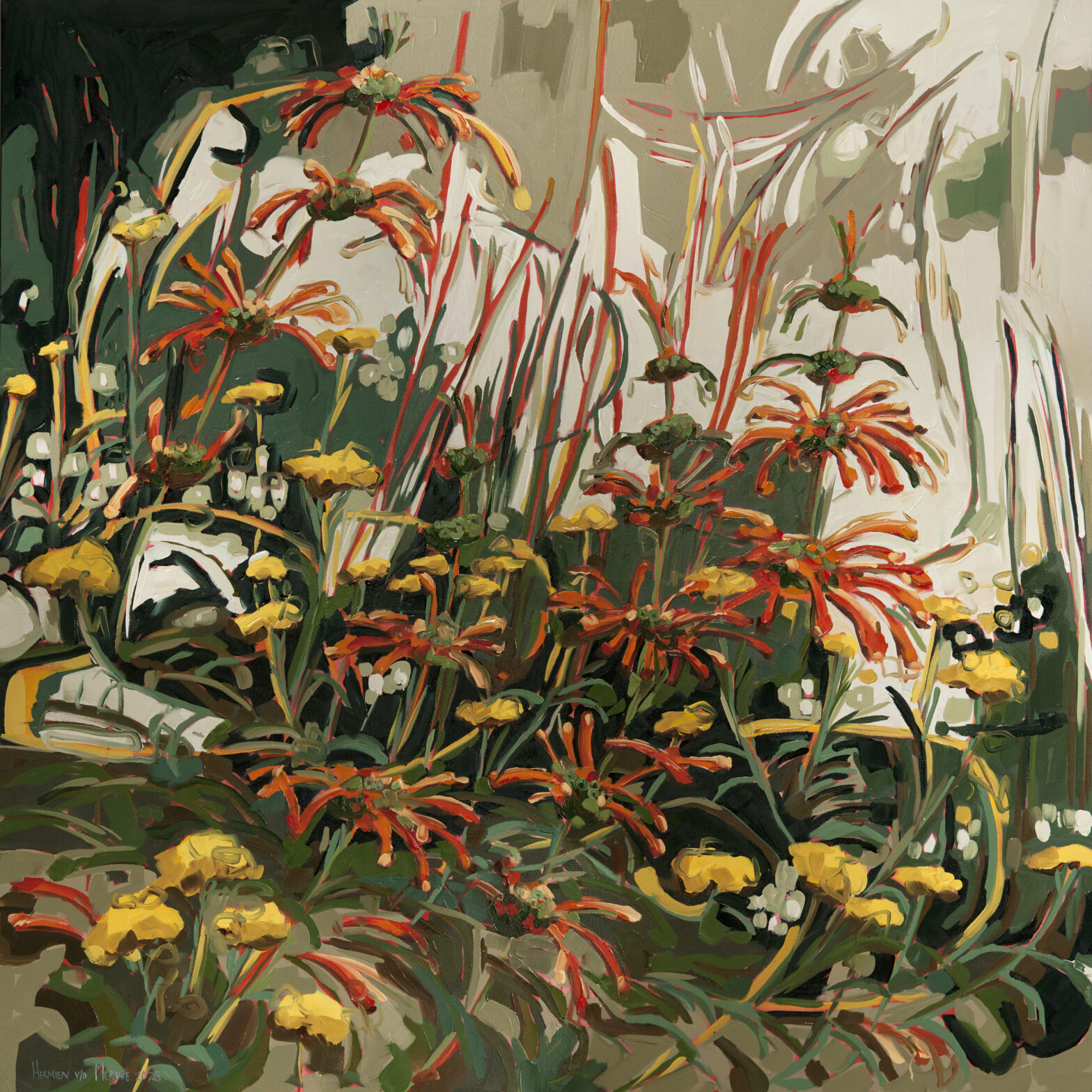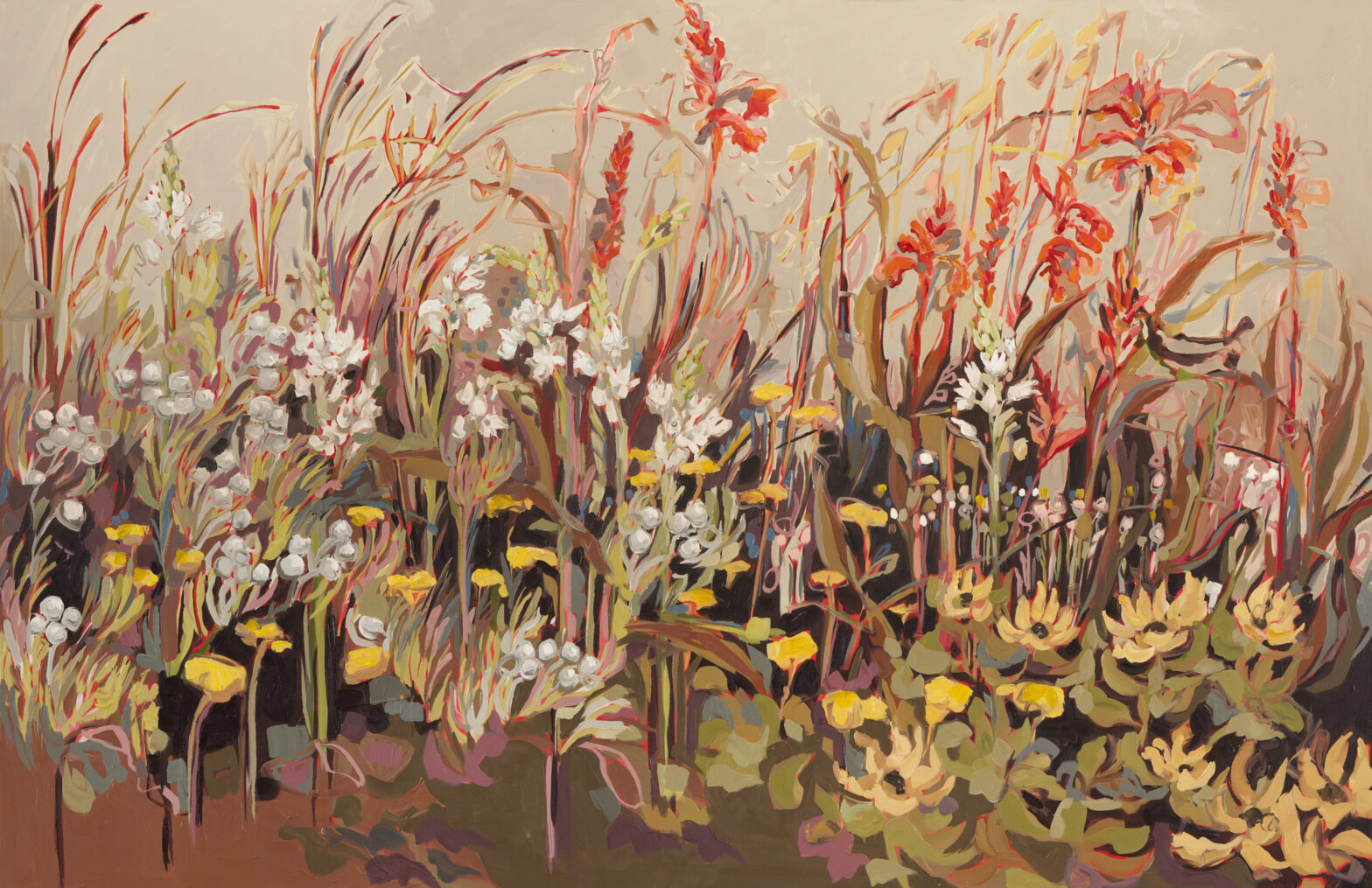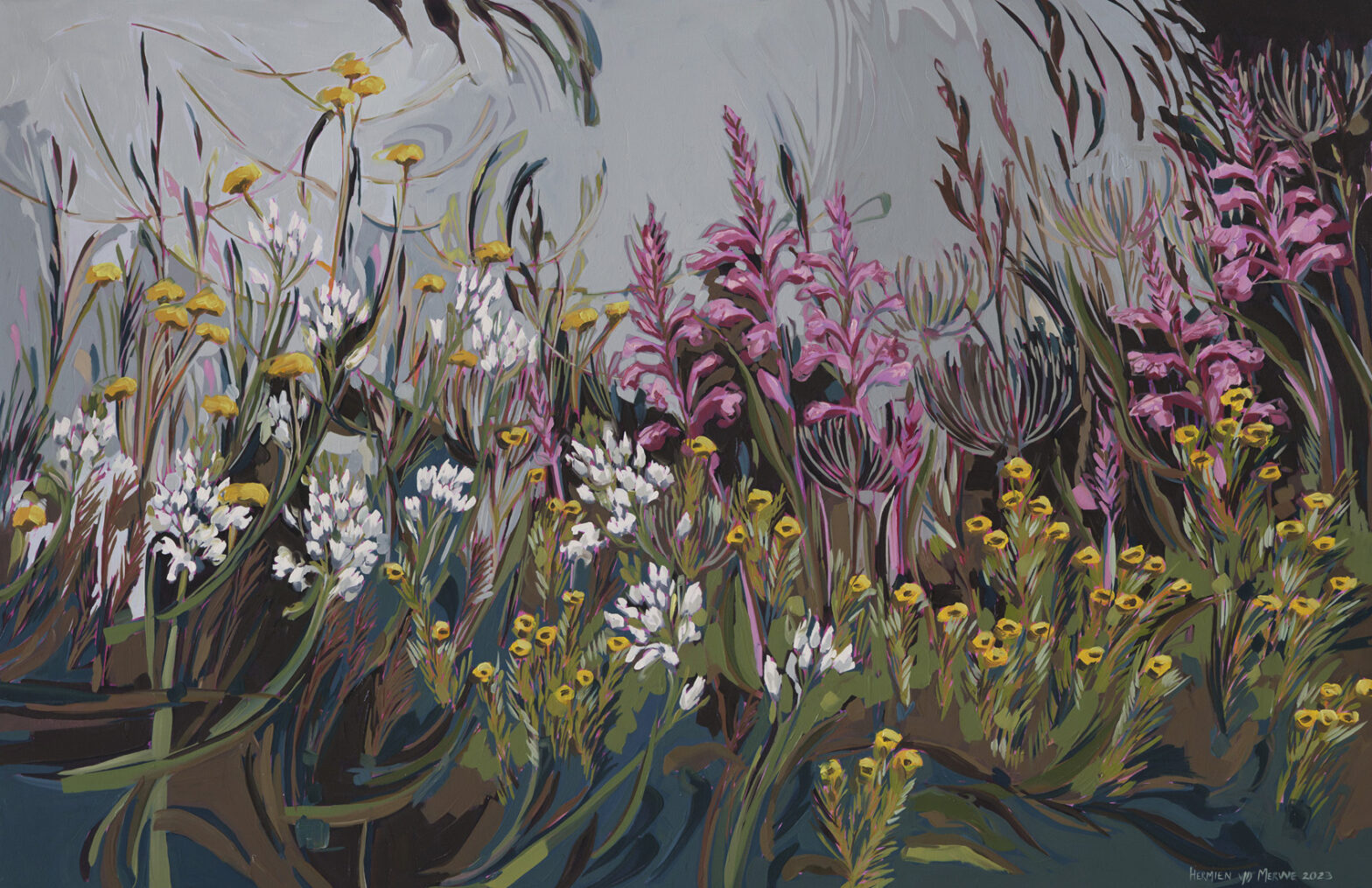 Fynbos landscape with Chinkerinchee, Watsonia and Helichrysum (Perception series) 1700x1100mm Oil on canvas